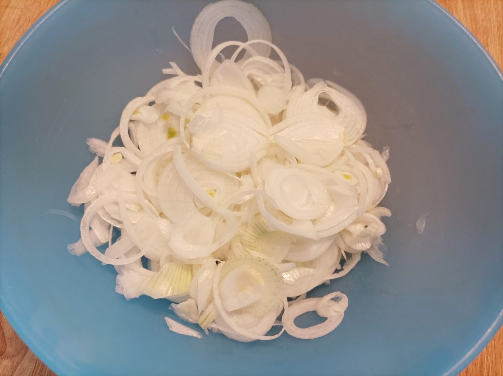After the time has passed, drain the onion and set it aside. Peel and slice the potatoes about 1/8 inch thick, then put them in water and leave them for 15 minutes.