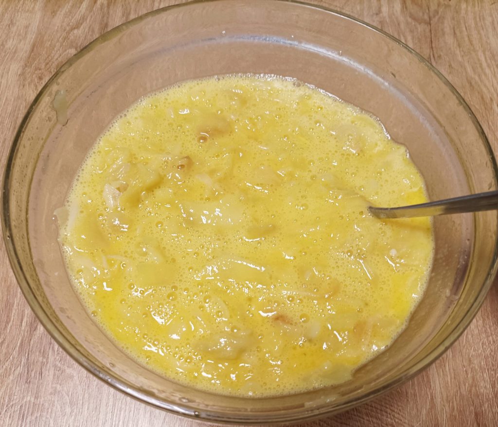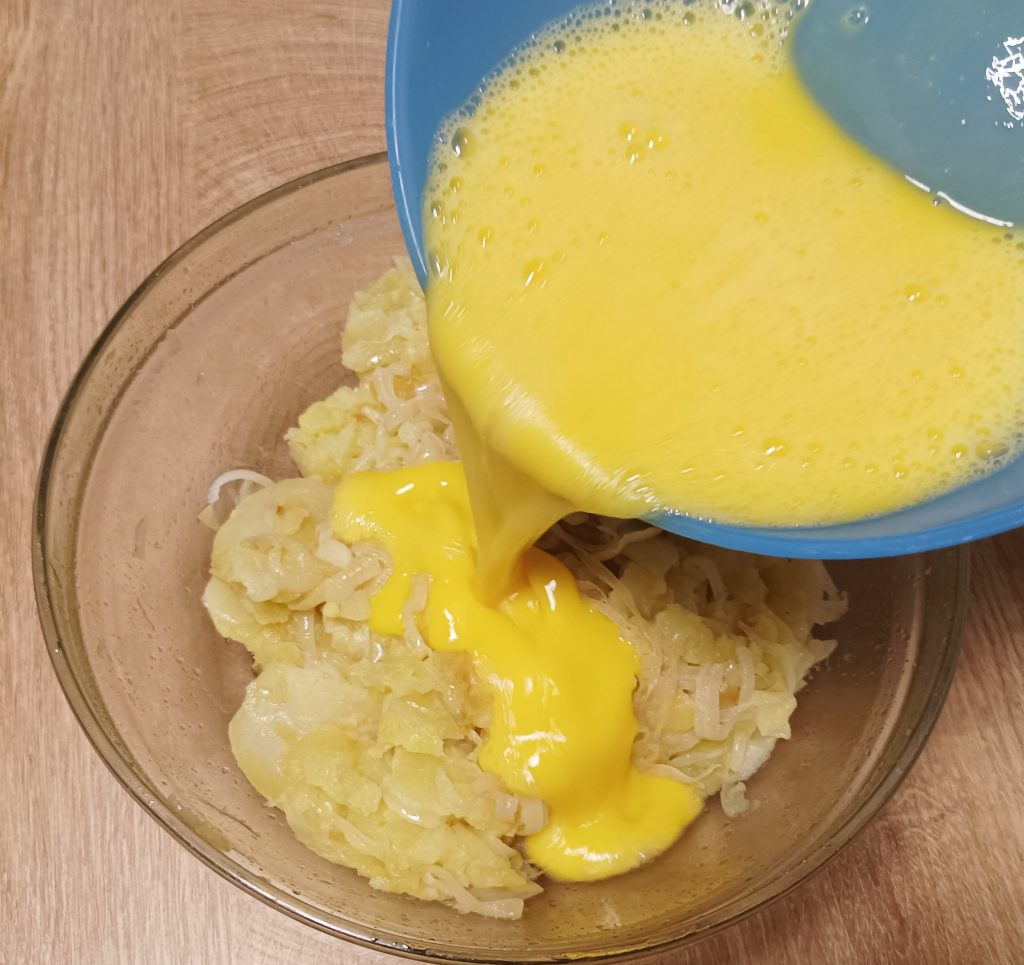 Beat the eggs, add the salt, and pour them over the potatoes and onions. Mix well to combine the ingredients.