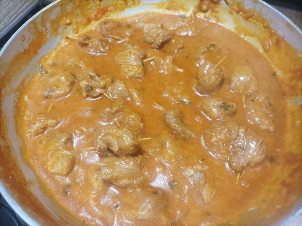 Pour the broth into the same pan where the cutlets were and add the onion, parsley, chili pepper, and curry. Cook for 5 minutes over moderate heat.