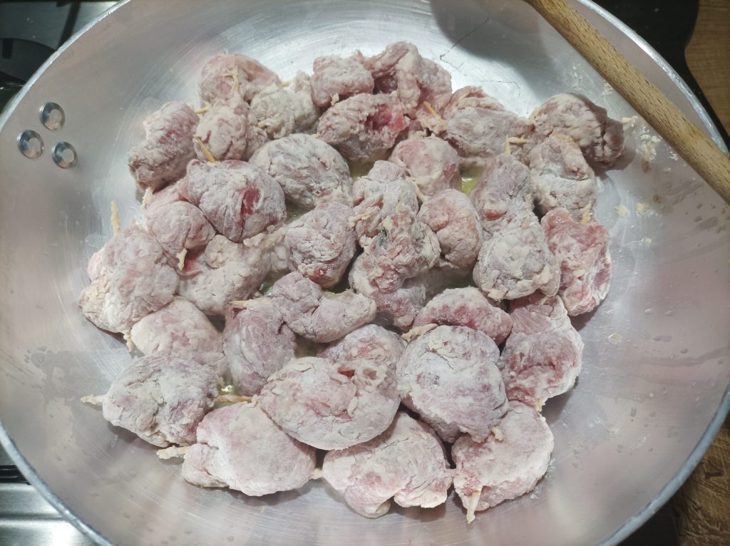Once it has reached the temperature, add the cutlets, increase the heat slightly, and brown for 5 minutes, turning them to prevent sticking, then deglaze with the wine, allowing it to evaporate for about 3 minutes over moderate heat.