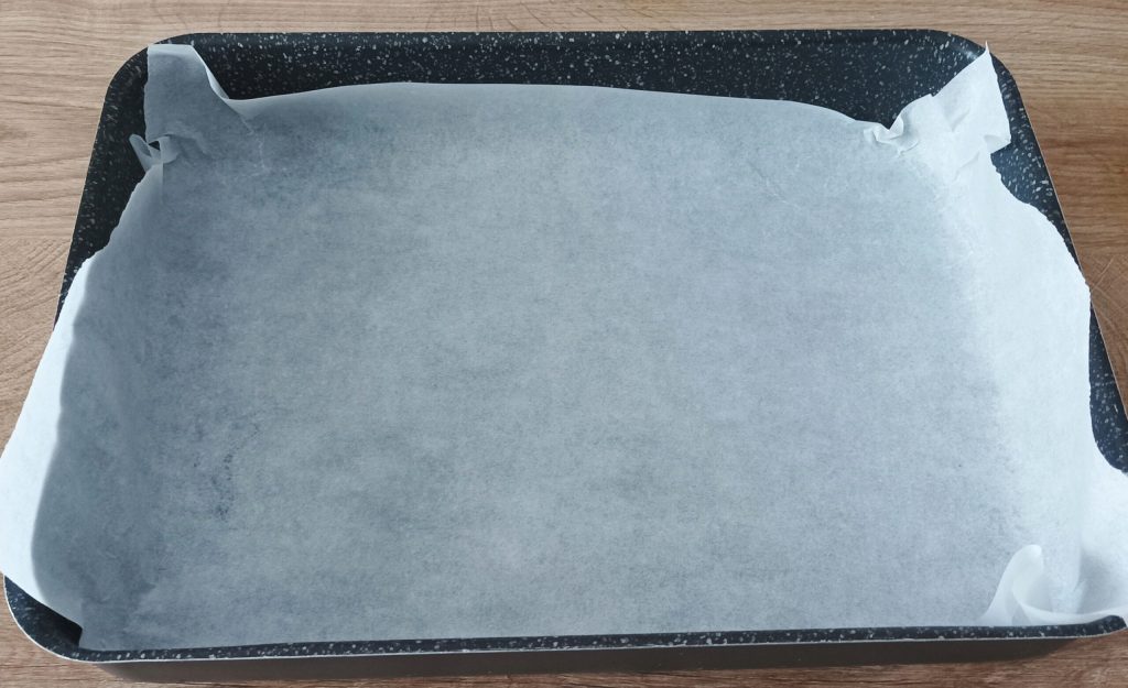 Line the bottom of the baking dish with parchment paper and pour in the eggs, gently tilting the dish to spread the eggs evenly, creating as regular a shape as possible.