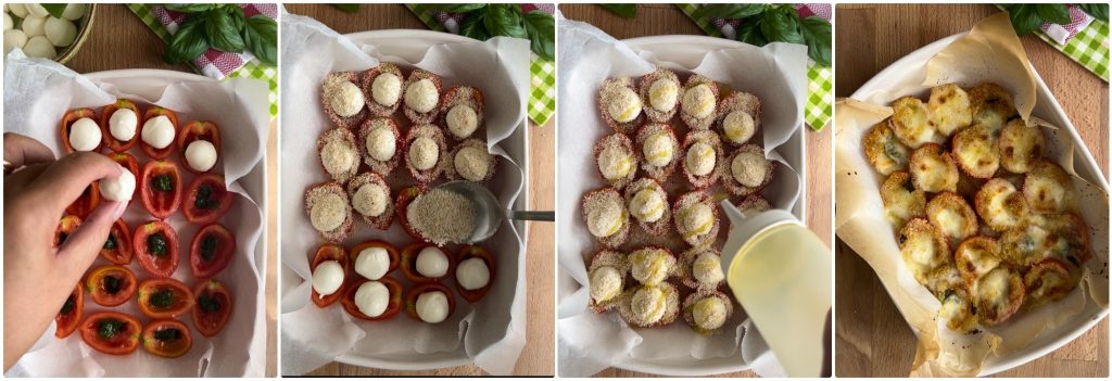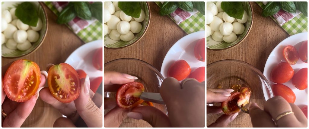 To make the baked cherry tomatoes with caprese mozzarella, the first thing you need to do is wash the cherry tomatoes under running water, cut them exactly in half, remove the inside, seeds, and juices by first scoring with a knife and then scooping with a teaspoon.