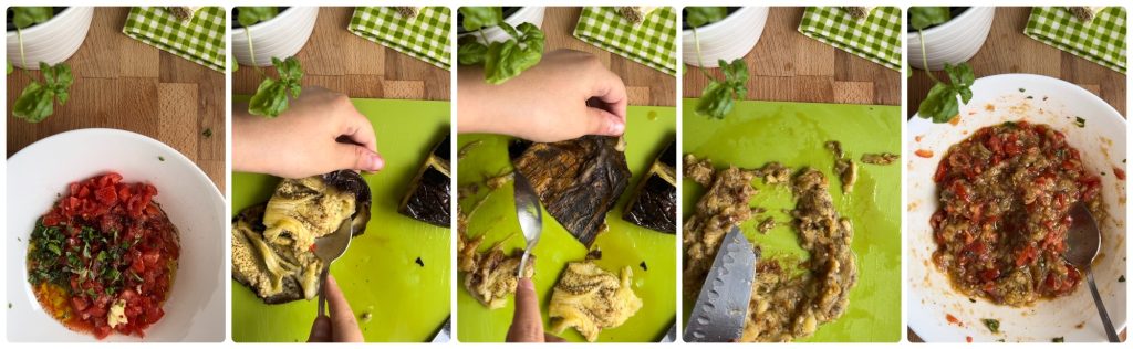 Open the foil and scoop out all the inner pulp of the eggplant with a spoon. It will be an extremely easy step. Mash the pulp on the cutting board with a knife to make it creamy and add to the cherry tomatoes.