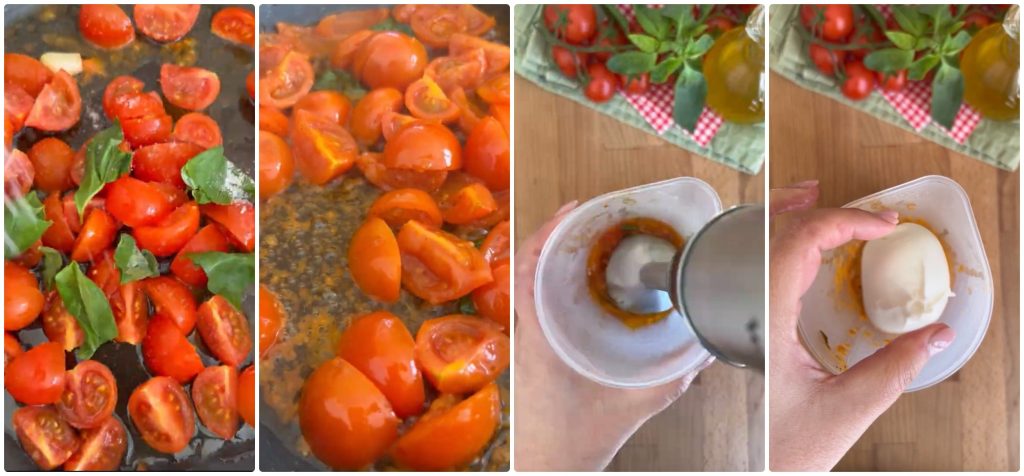 At this point, transfer the cherry tomatoes to a container suitable for an immersion blender. Blend with a few more basil leaves, add the whole burrata, and blend until you get a delicious cream.
