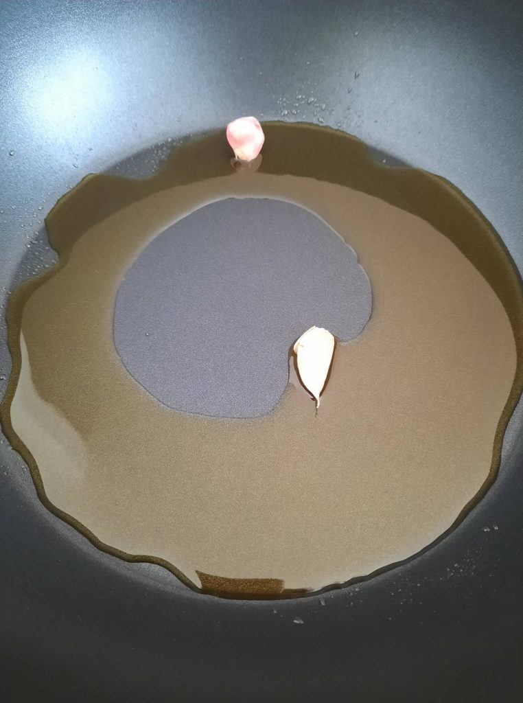 Boil a pot of water for the pasta, meanwhile let a crushed garlic clove sauté in a large pan.