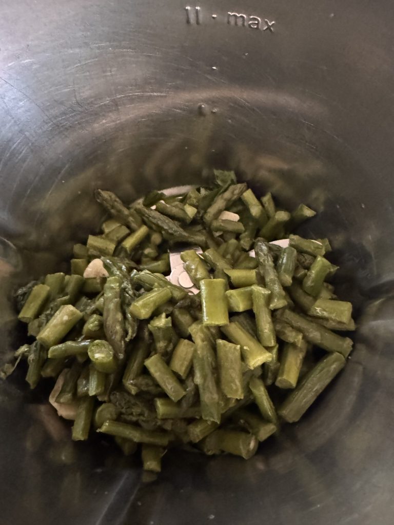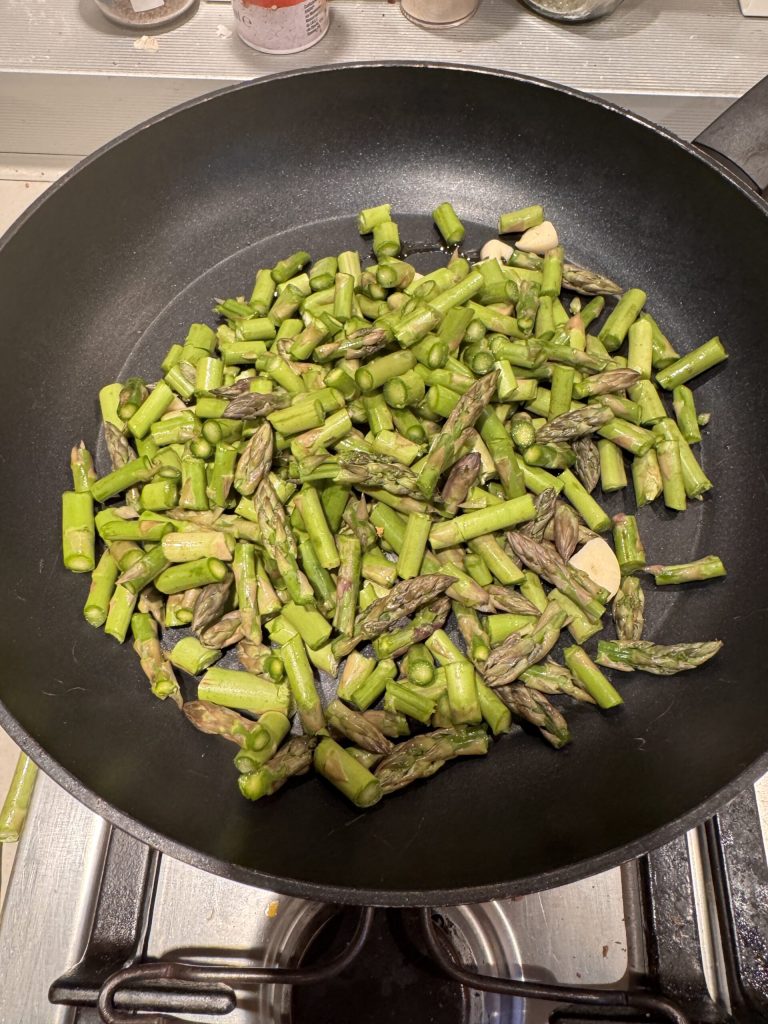 Add the cooled asparagus (you can remove the garlic if you don’t like it).