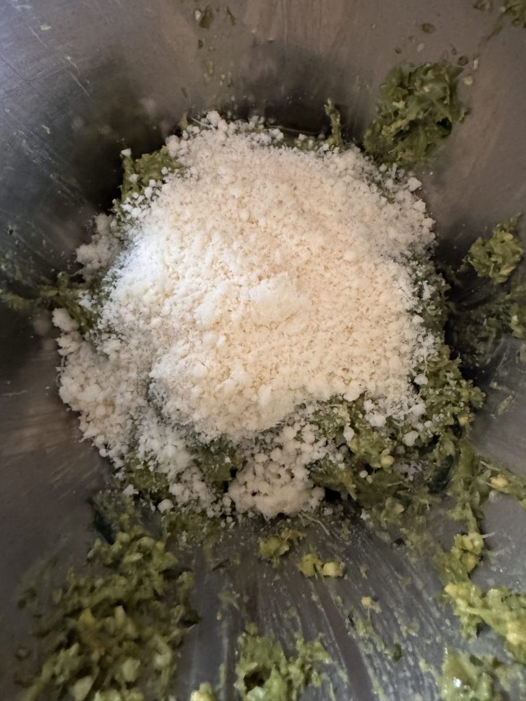 Bring the ground vegetables and nuts back to the bottom with a spatula and add the two cheeses.