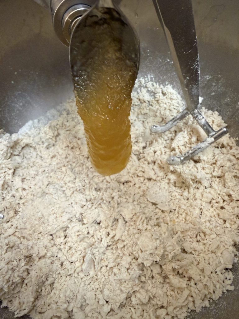 Add the honey and pour in almost all the remaining water, but keep about 50 g aside for the final stage. Raise the speed slightly and let the machine work for about 20 minutes.