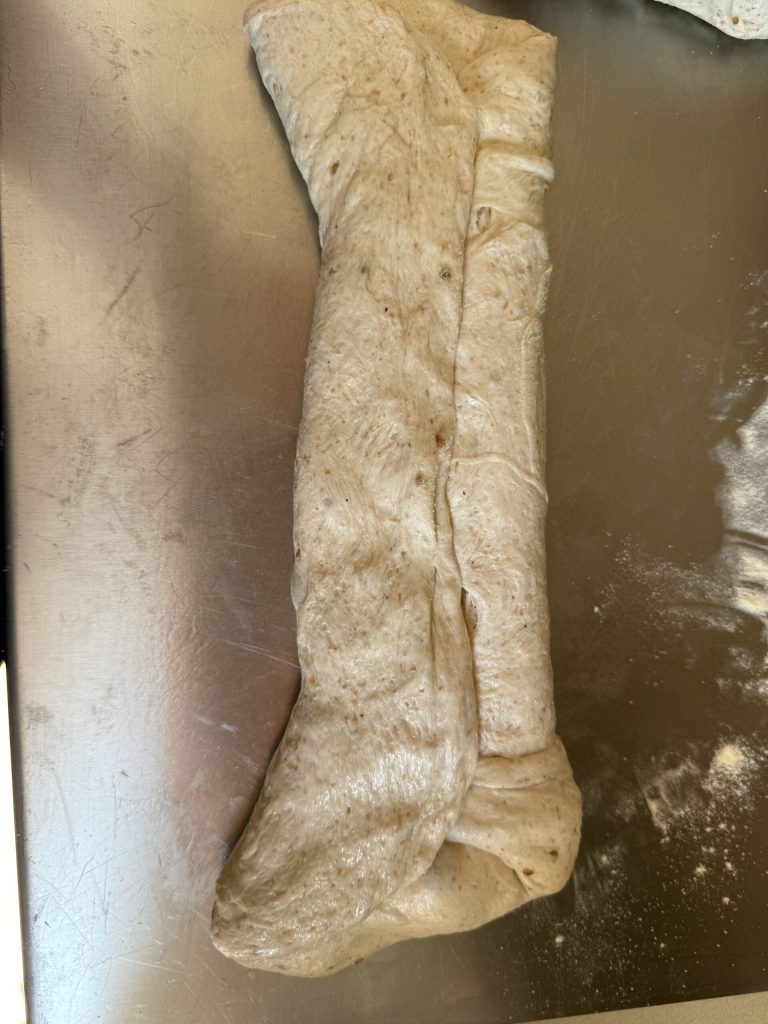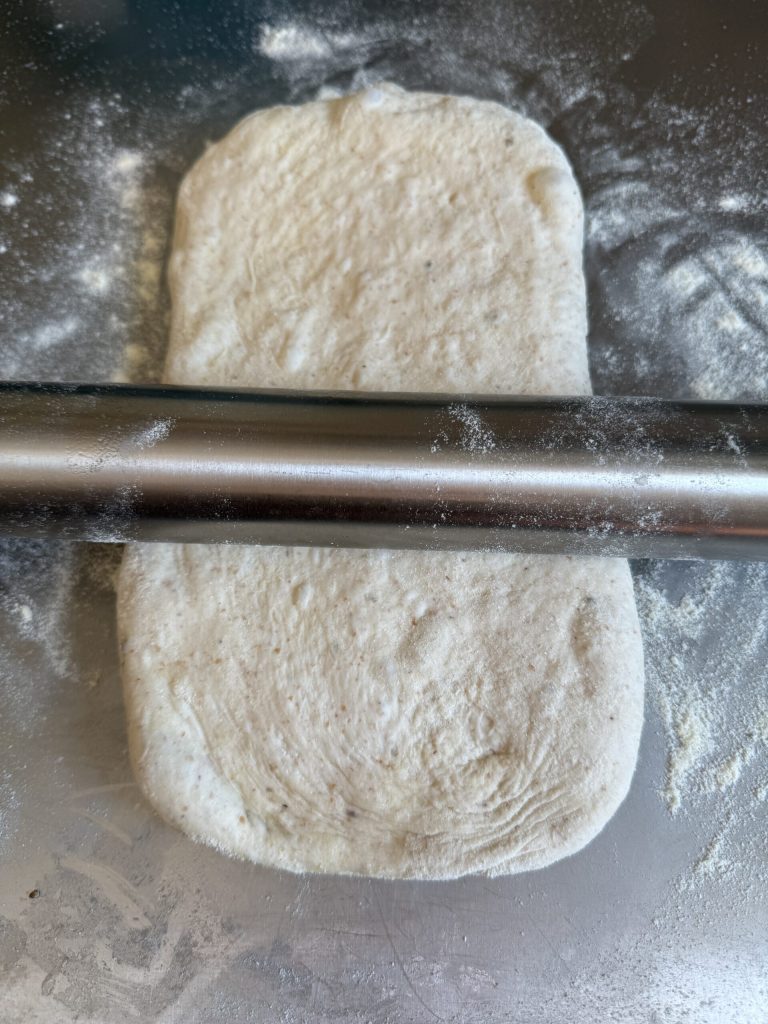 Transfer the Lagana dough onto your work surface and perform a slap and fold to strengthen the structure. The dough will be very tenacious, since it is not overly hydrated.