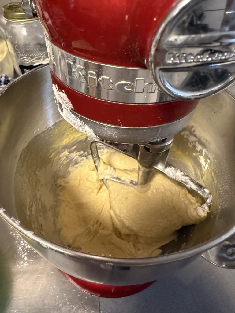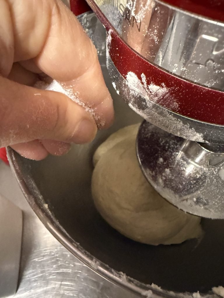 • Quickly beat the eggs and add them to the stand mixer, letting them incorporate into the dough.