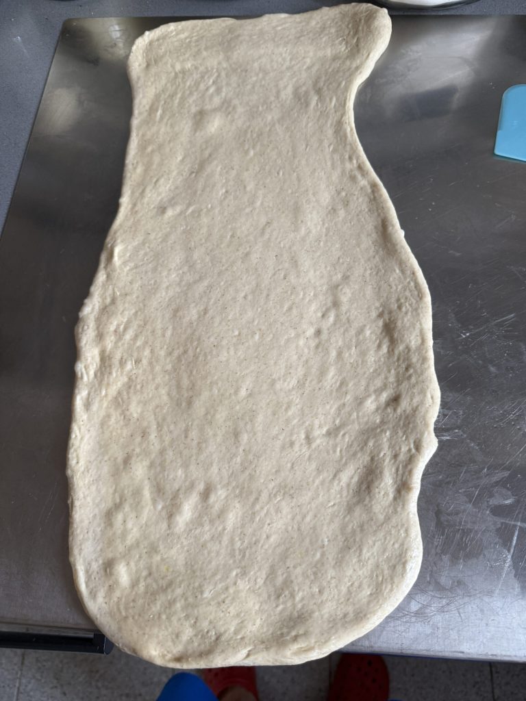 • Take the first piece and roll it with the rolling pin into a long strip.