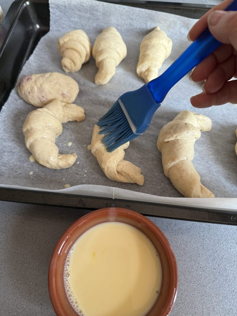 • As the croissants are formed, place them on two baking sheets lined with parchment paper, spaced enough apart. As you can see from the photo, I made small leavened pastries with the leftovers with jam just to not waste anything!