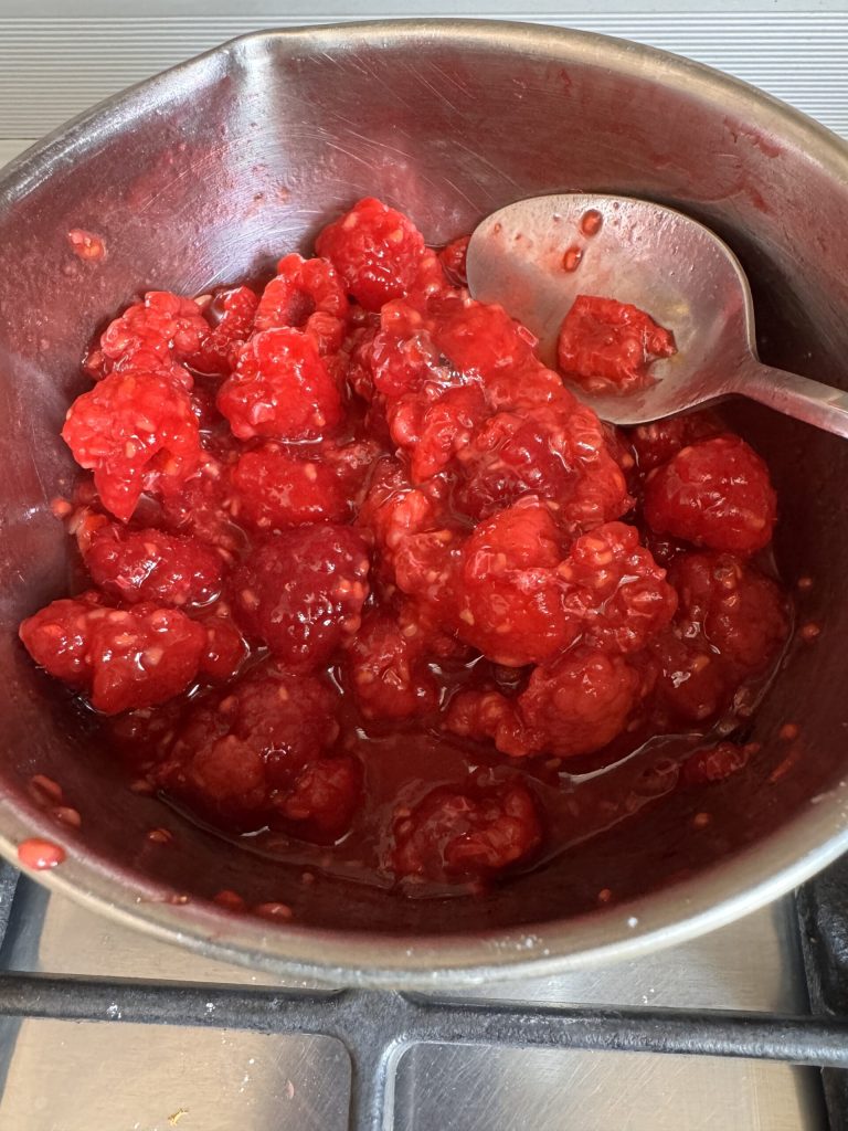 The raspberries will gradually melt, and some of the liquids will evaporate. When it becomes thick enough, with no visible raspberries, it’s ready for the next step.