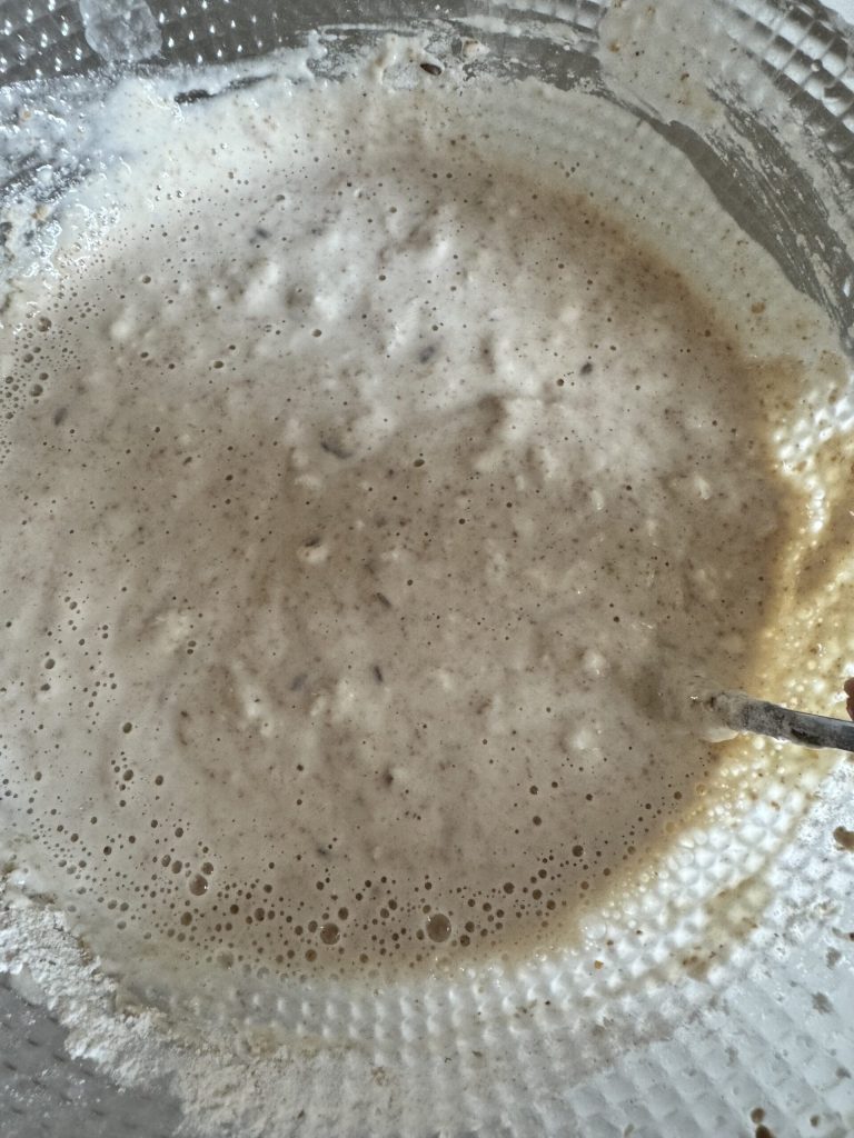 Let everything dissolve and mix perfectly. If the sourdough is in good shape, it will create all these bubbles during mixing.