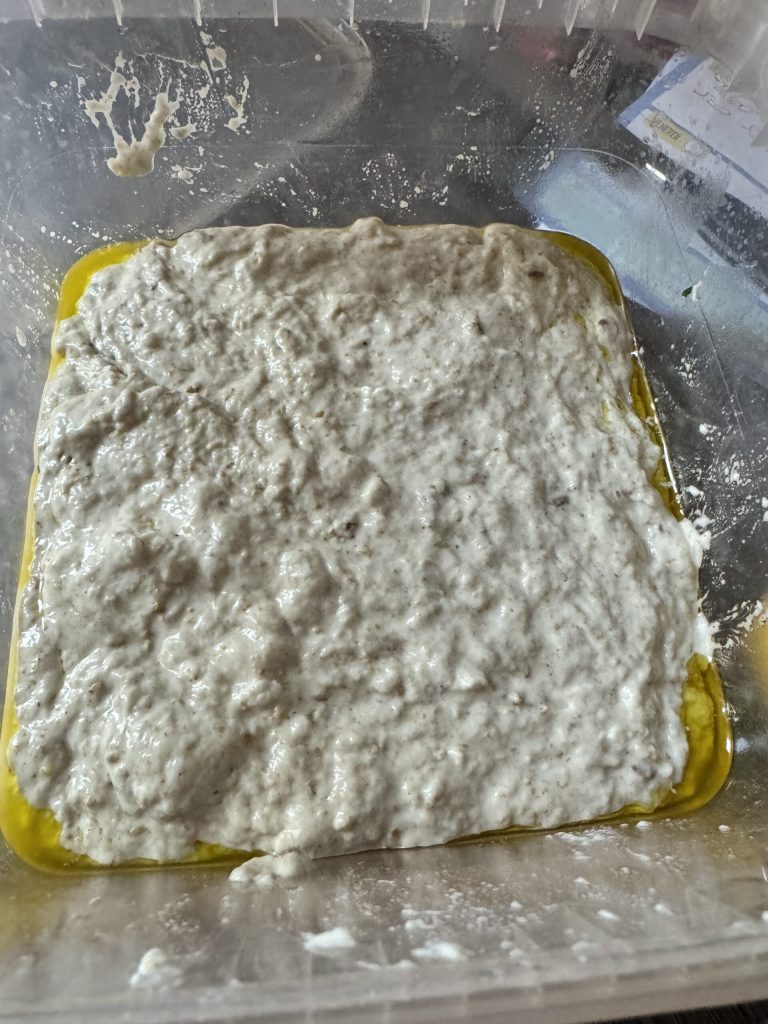 Transfer the dough, which will appear rustic, into a container where the oil has been poured.