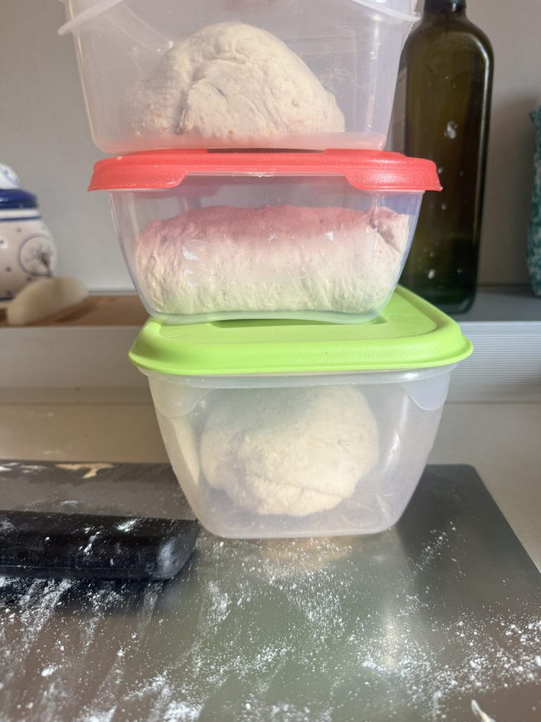 For the second rise, I put them in food containers where the balls fit “snugly.” Of course, you can do it in any other way. Wait about a couple of hours (time will vary depending on the external temperature)