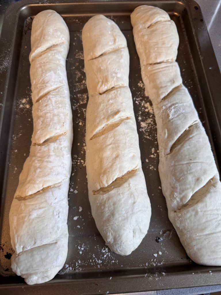 When they have risen (about 1 and a half hours later), flip them over with the help of your arm onto a baking sheet and make sharp, oblique cuts. To make them crunchier, this last rise can be done in the fridge for about 2 hours if you have more time.