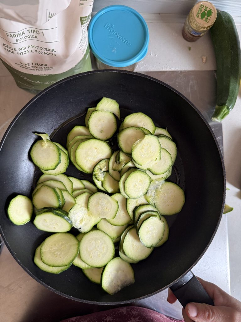 • As soon as the zucchini are wilted, raise the heat and add the Taggiasca olives, stirring gently to flavor all the vegetables evenly. This step ensures that the topping is perfect for the Spanish coca without yeast, enhancing the taste of the zucchini and olives. Once the zucchini are well browned, transfer them to a plate to cool.