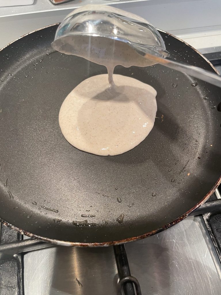 When ready to cook, pour a teaspoon of vegetable oil into the pan and spread it with a paper towel. Turn on the heat, wait for the pan to get hot, and pour a ladle of batter in the center.
