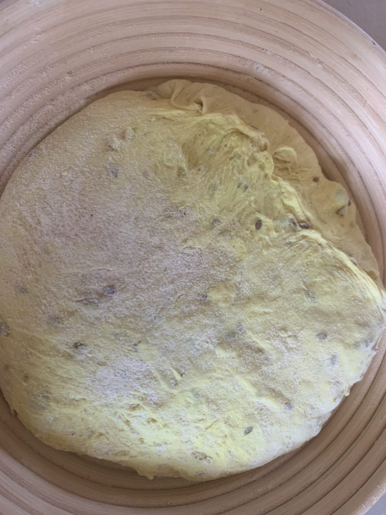 The main ingredient of this bread is the turmeric bread mix. In the one I bought, there were two packets of dry yeast to make the bread. I obviously discarded them and created a recipe for sourdough, also adding some all-purpose flour. I didn’t add salt because it was already in the mix. These flours are relatively weak, so they rise quite quickly in this heat. You can use the provided dry yeast, and in that case, it will rise much faster.