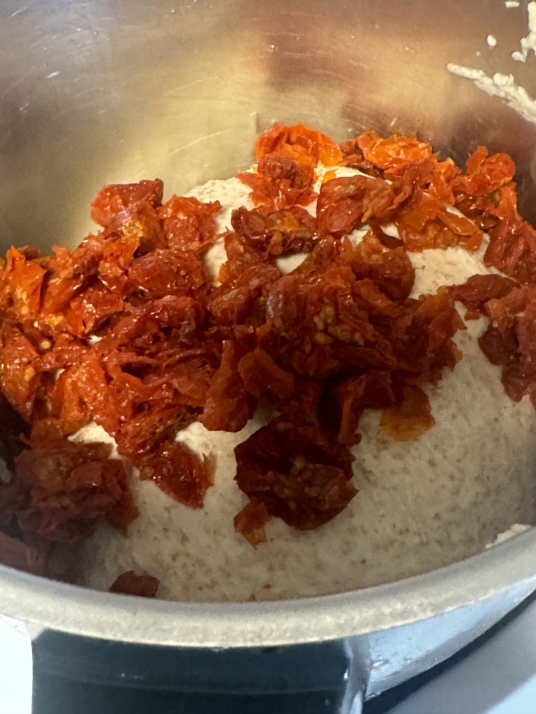Return the dough to the mixer bowl and add the sundried tomatoes. Mix until the dough becomes compact and smooth again.