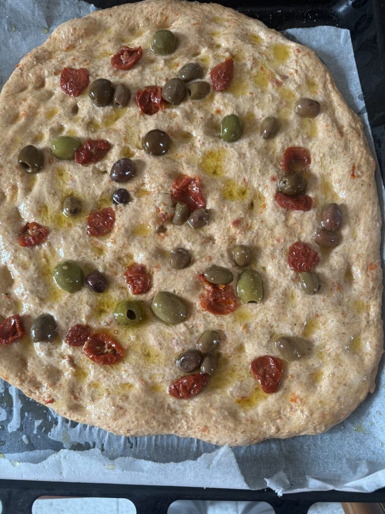 The next morning, take the container out of the fridge and let the dough acclimatize. The time will depend on the ambient temperature; in summer, maybe an hour will suffice, while in winter, it may take at least two and a half hours. Cover the baking pan with lightly oiled parchment paper and place the whole wheat flatbread dough with sundried tomatoes and olives on it.