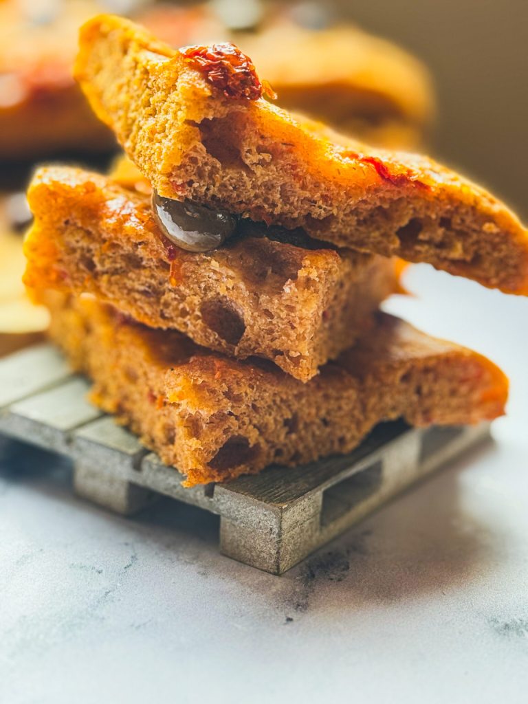 The whole wheat flatbread with sundried tomatoes is yet another version of a focaccia on my blog because it is a leavened product that gives me immense satisfaction. Combining flour, water, and yeast with different ingredients to create tasty and original focaccias is a great zen exercise. Perfect as an appetizer, snack for adults and children, starter with cold cuts, this moist, oily, and rustic flatbread is truly a perfect wildcard for any situation!