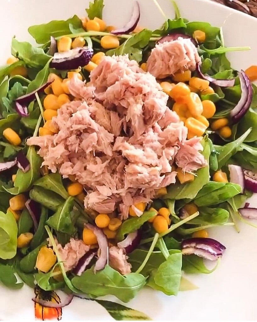 Drain the tuna in water, place it on a bed of baby lettuce, and add corn and thinly sliced Tropea onion. Don’t forget salt and olive oil.