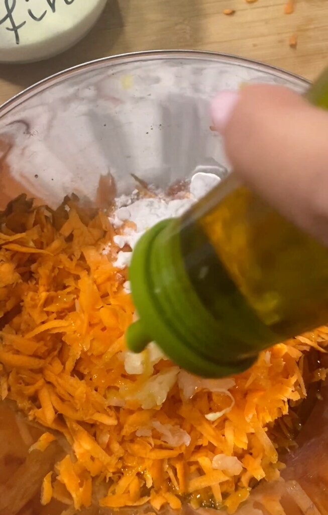 Peel and grate the carrots and onion with a grater or a chopper and place them in a bowl.