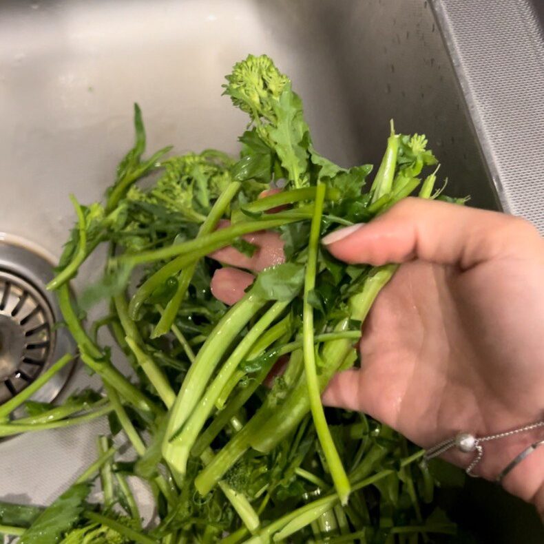 • After cleaning the broccoli rabe for the main course, you will have the scraps left, consisting of stems, flowers, and harder parts. Rinse them very well and put them to boil in water.