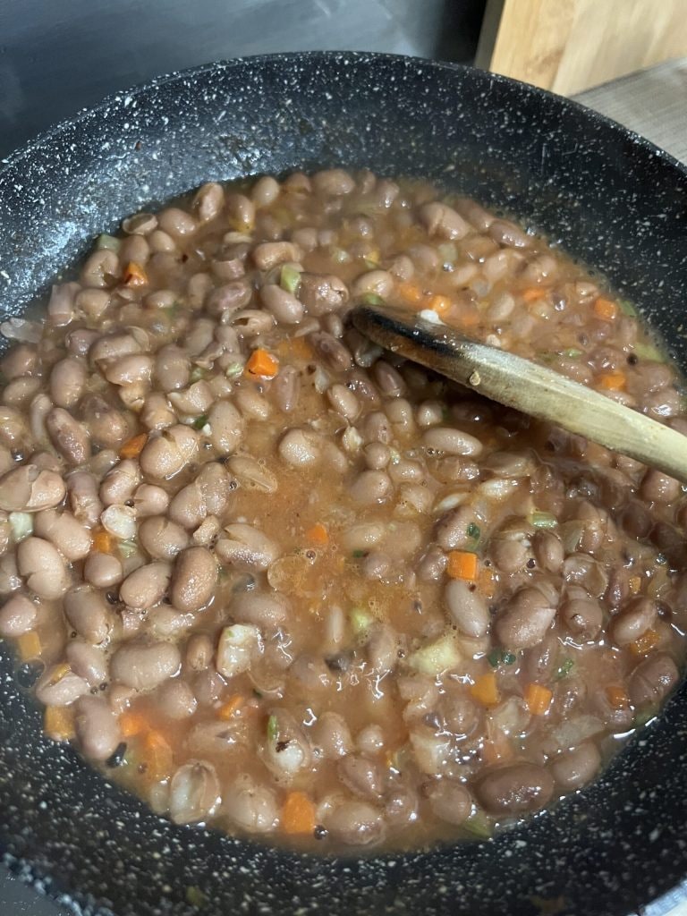 • In the skillet, sauté a drizzle of olive oil with chopped onion, chopped garlic, chili pepper, and spices (paprika and coriander). Now add the beans and let them absorb the flavors for two minutes before pouring half a cup of hot water and the tomato paste.