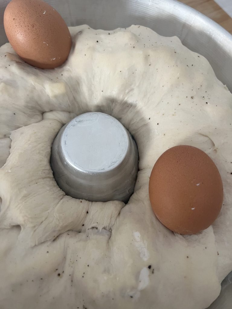 – Place the raw eggs on top of the dough and secure them with two crossed strips of dough. Spread a little more lard over the entire surface of the casatiello.Bake in a conventional oven at 356°F for 50 minutes on the lowest rack and 5-10 minutes on the top rack, until it is nicely golden.