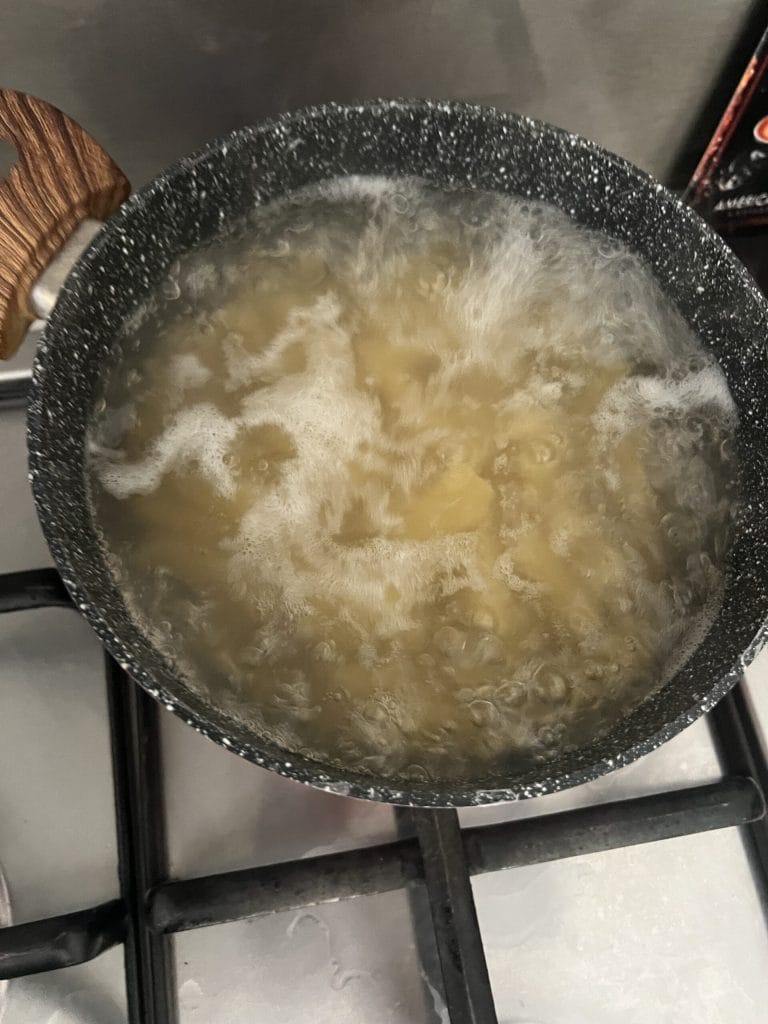 We’ll prepare this dish in the time it takes for the pasta to cook. Put a pot of water to boil on the stove. Meanwhile, in a bowl, combine the eggs, Parmesan, salt, and pepper, and mix vigorously with a fork or whisk, adding a ladle of cooking water.