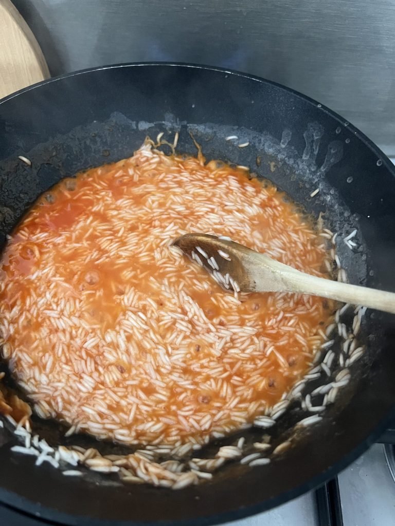 • Once the wine has evaporated, lower the heat a bit and begin to pour in the broth. As the rice absorbs it, add more. When halfway cooked, add ladles of the cooked tomato passata.