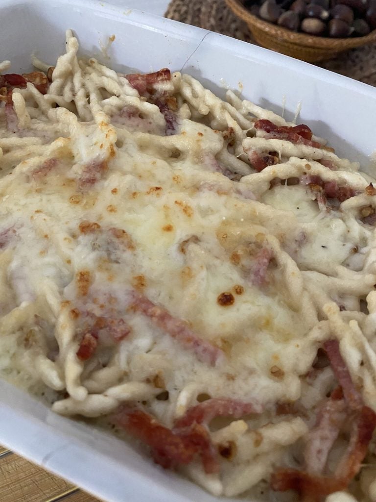 In the pot, mix the pasta with the béchamel, add the provola well-drained and diced, and finally the speck and walnuts. Place everything in a baking dish and cover with the grated parmesan.