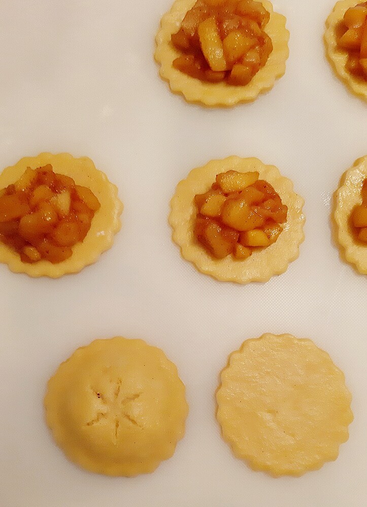 Fill 12 discs with a generous teaspoon of apples and cover with the other circles of dough, pressing along the edges to seal them well.