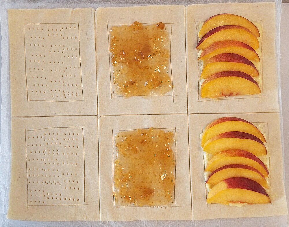 Wash and dry the peaches, then slice them into 1/4 inch slices. Lay them on the jam, you will need 5 or 6 slices for each puff pastry.