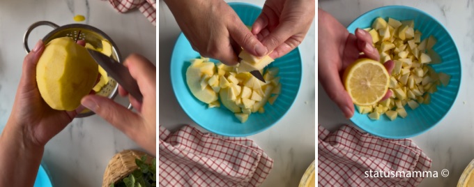 • 5. Prepare and add the apples: Peel and remove hard parts with a knife, cut into cubes in a bowl and add a splash of lemon juice, mixing everything with a spoon.