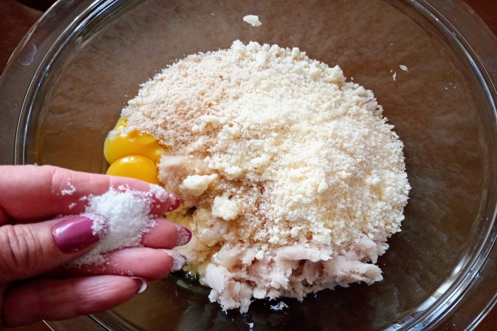 Add breadcrumbs, grated Parmesan, and eggs to the fish.