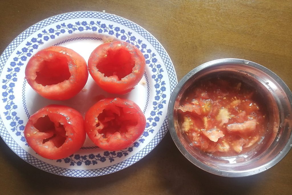 Wash the tomatoes and cut off the top, then carefully scoop out the insides with a spoon and the help of a knife, avoiding breaking them.