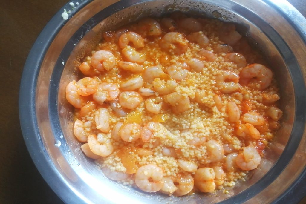 Pour the warm shrimp into the cous cous. The sauce should cover it; if necessary, add a bit of warm water.