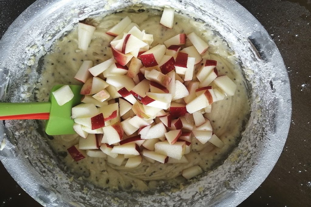 • After adding all the flour, finish by folding in the apple cubes and the walnuts; mix thoroughly.
