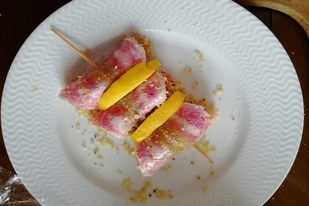 On each red mullet fillet, sprinkle a bit of aromatic breadcrumbs, roll it up.