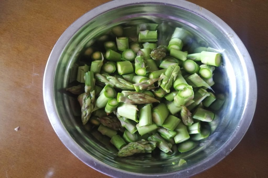Clean the asparagus by removing the tough stem part, wash under running water, and cut into small pieces.