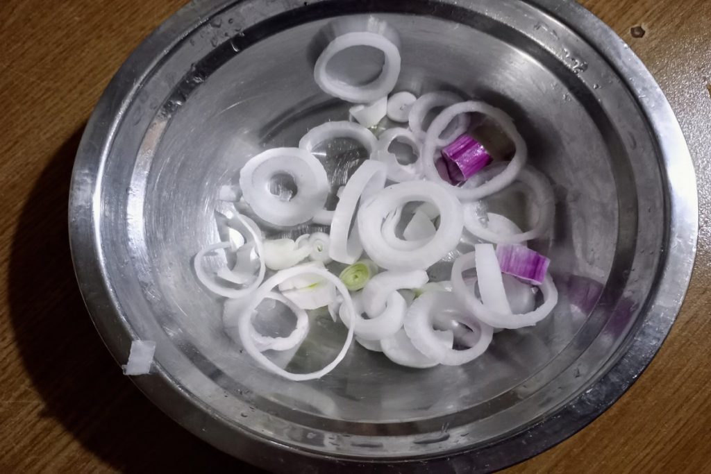 Continue by cleaning and slicing the red onion into rings, separate the joined rings by hand.