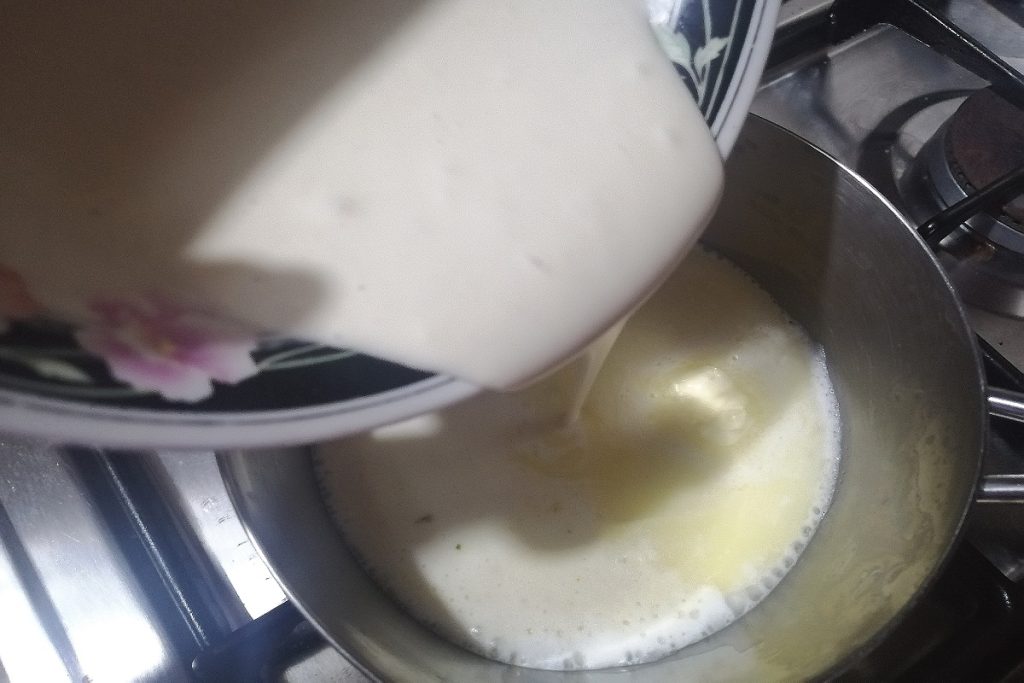 • In a bowl, pour some flour and water to prepare a thick batter, which you will pour into the hot milk.