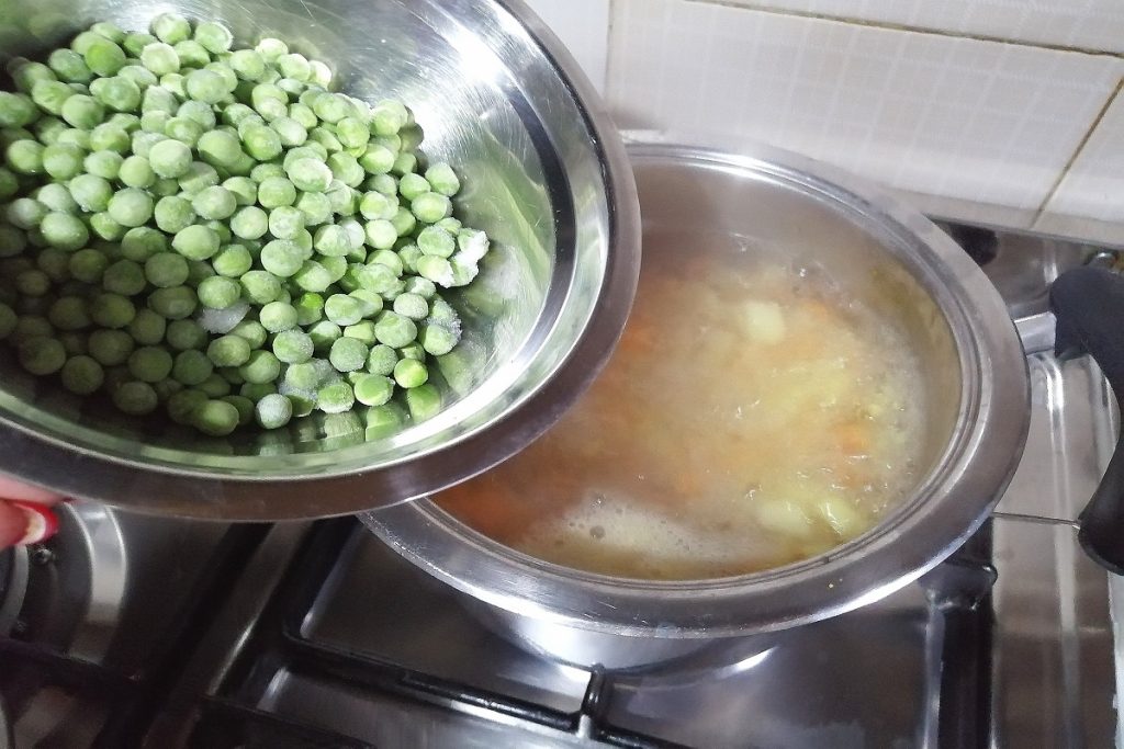 • After 8 minutes, add the frozen peas and continue cooking for another 8 minutes.