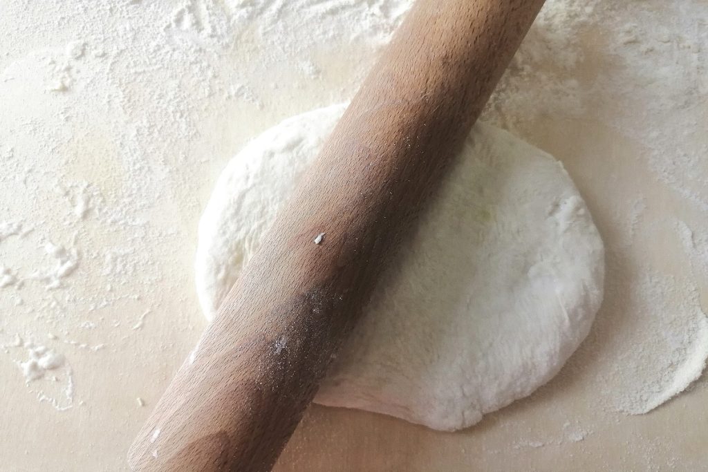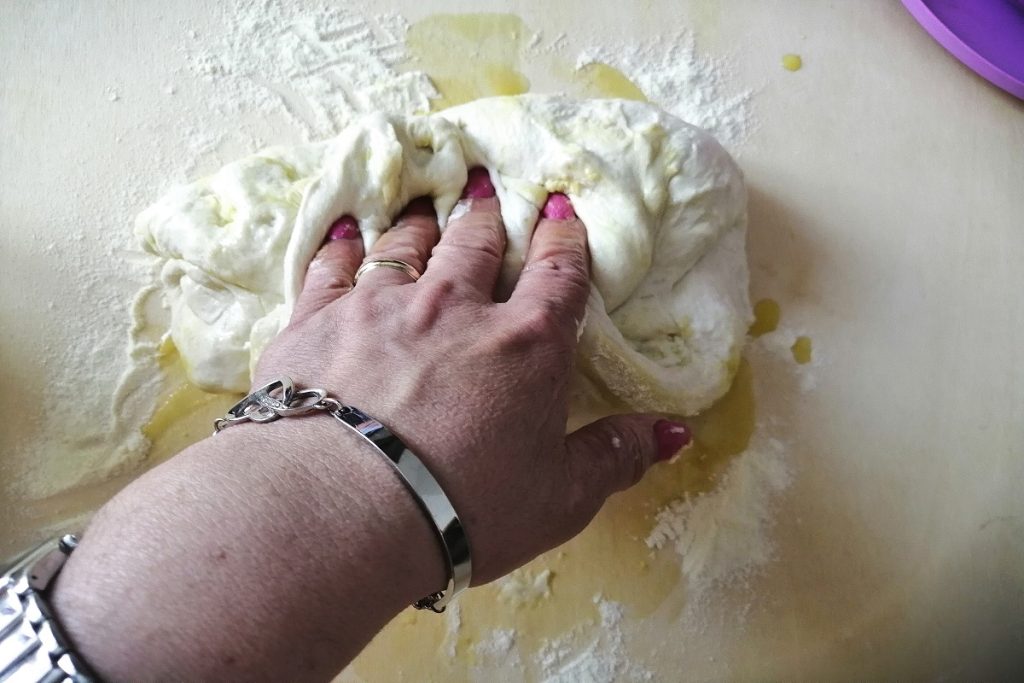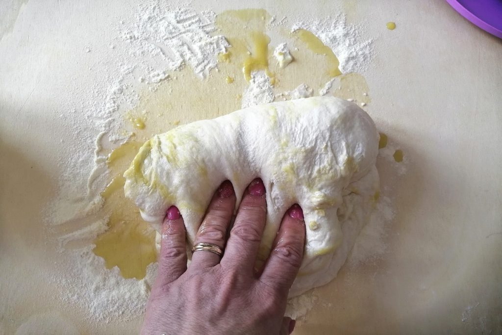 Flatten the loaf giving it an oval and elongated shape, roll the dough onto itself.