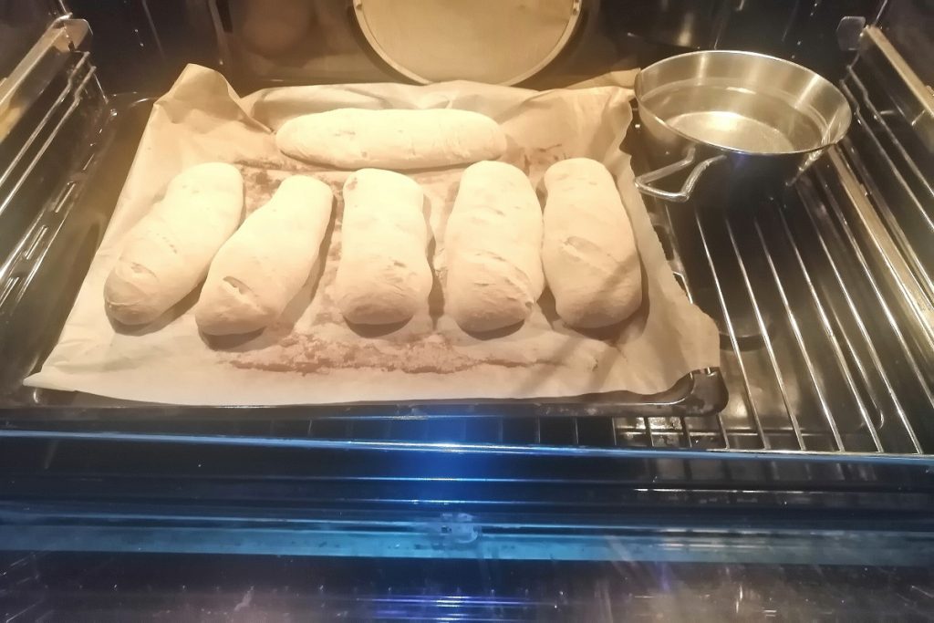 Preheat the oven to 428°F with a pot of water inside, on the lower part of the oven. When it’s well heated, bake the ciabattas and cook for 10 minutes with the pot inside, then remove it, position the bread a bit higher, and let it bake for another 20 minutes at 392°F.