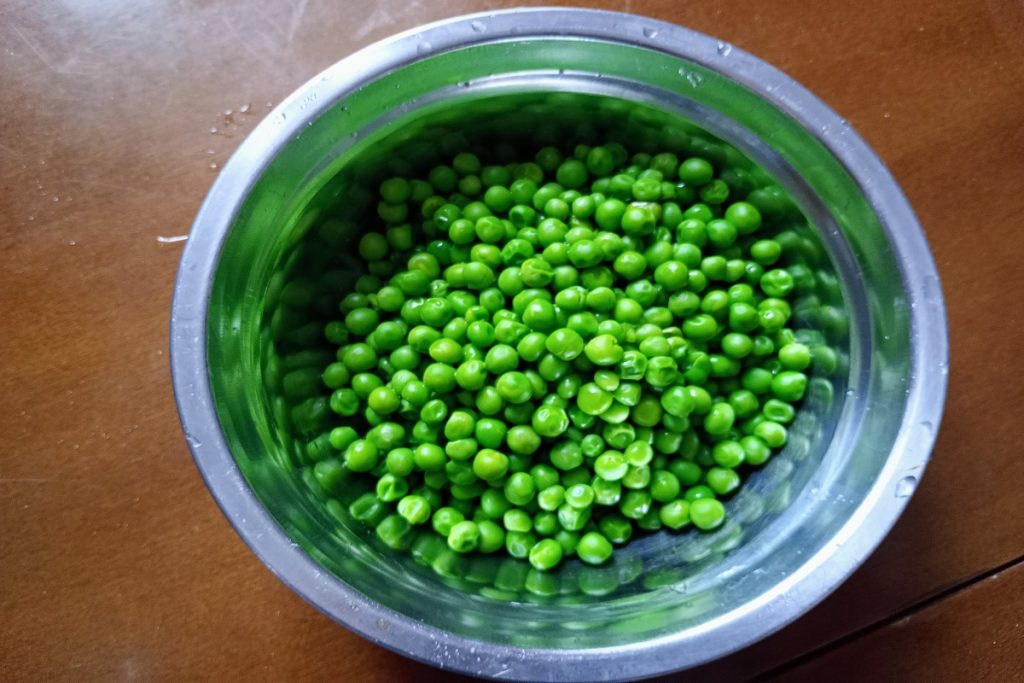 Meanwhile, blanch the peas in salted water, being careful to leave them a bit al dente. Once cooked, drain them and rinse under cold water to maintain their vibrant color.